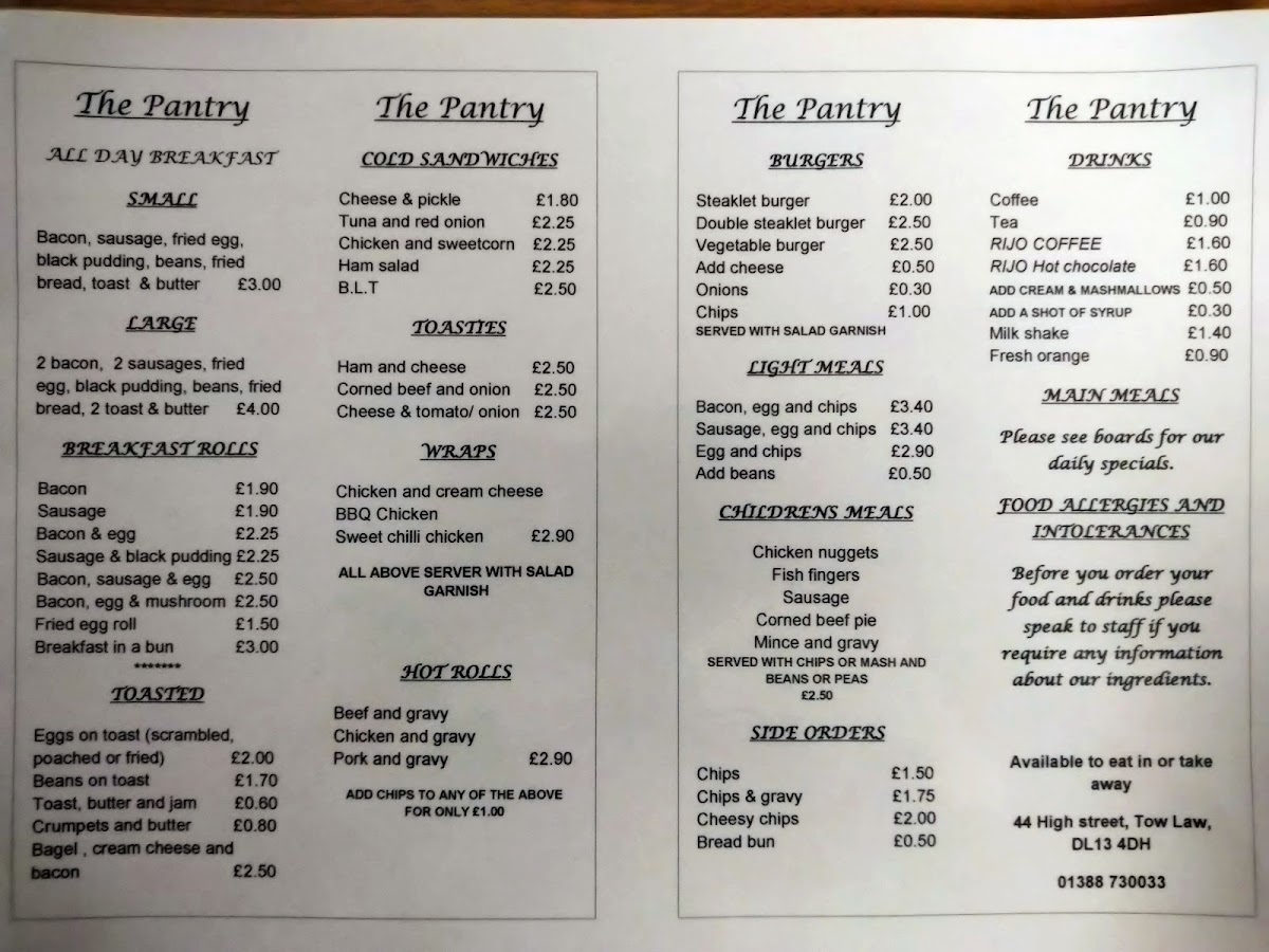 Located at 43 High St, Tow Law, The Pantry is a delightful café offering a robust menu that genuinely caters to all. Start your day with an all-day breakfast featuring crispy bacon, sausages, and eggs perfectly cooked to your liking. If you're in the mood for something lighter, the toasted bagel with cream cheese and bacon is a must-try at just £3.75.